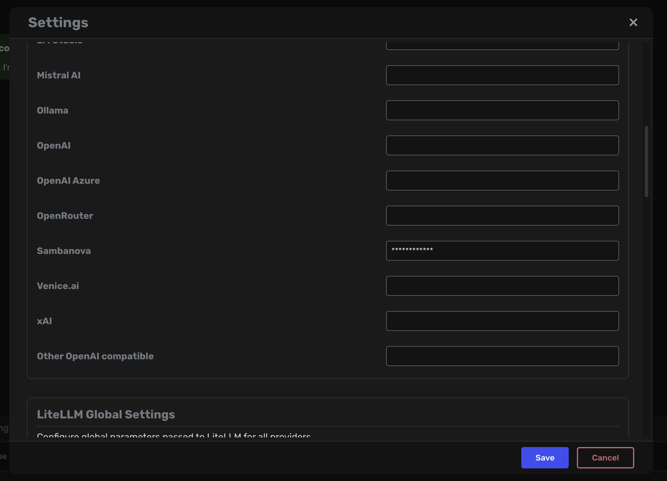Click Save to persist your settings and establish the connection to SambaNova Cloud.Verification