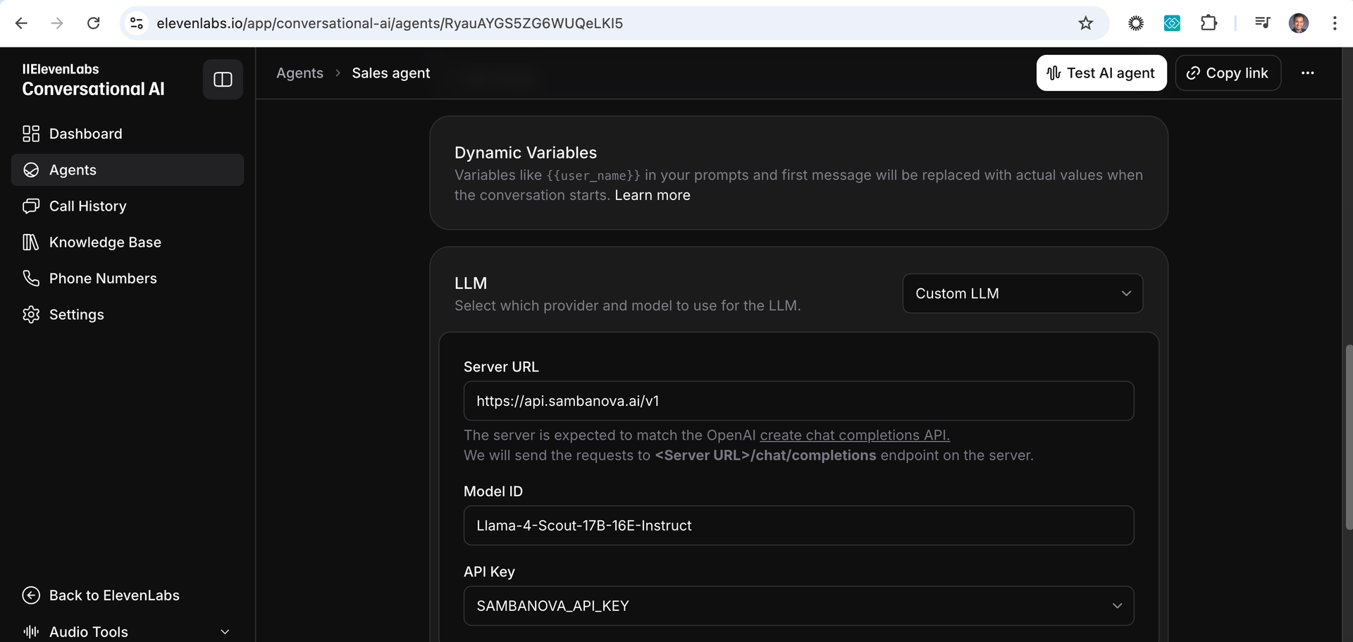 - Test your setup by selecting Test AI agent followed by Call AI agent.